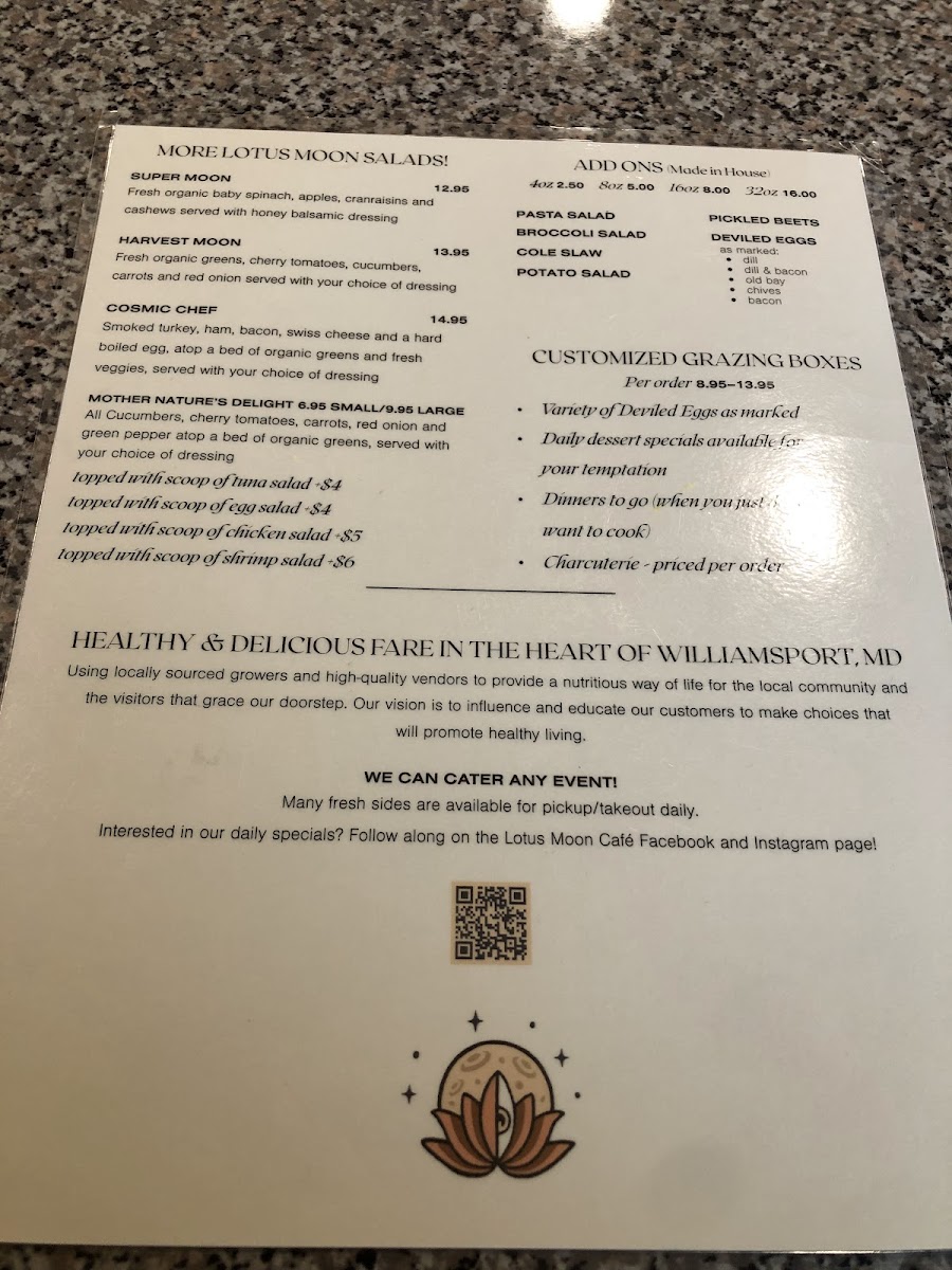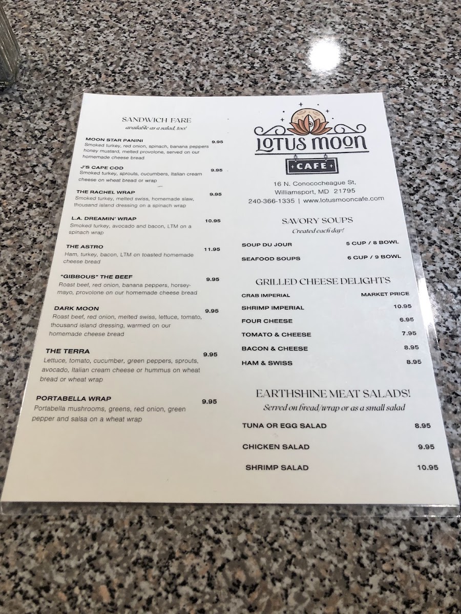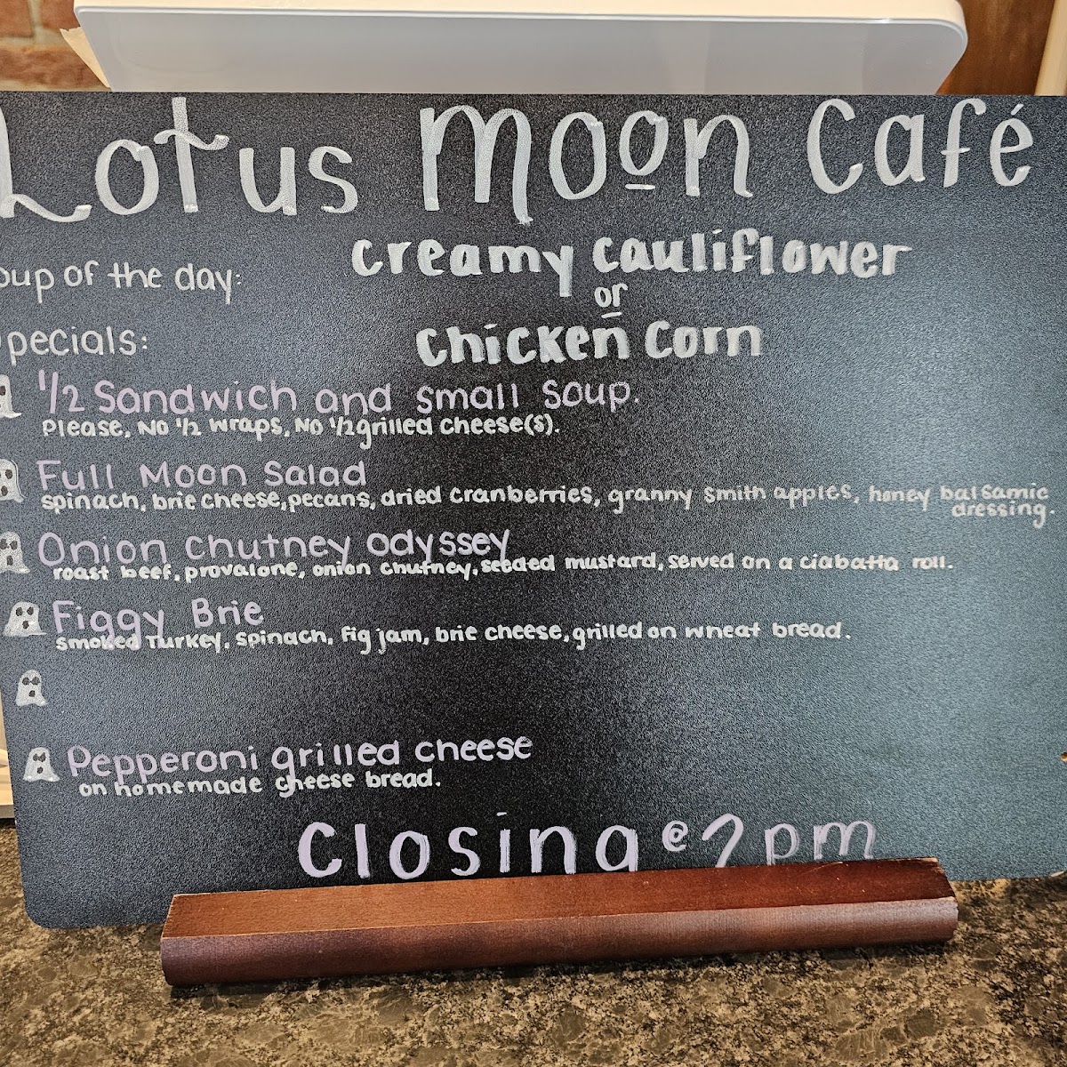 Welcome to Lotus Moon Cafe, a culinary gem nestled at 16 N Conococheague St, Williamsport, MD. Our menu is a delightful journey through flavors and textures, promising a feast that caters to all taste buds. Dive into our specialties and start your experience with the creamy indulgence of our Cream of Crab Soup or the heartwarming French Onion Soup. For the sandwich aficionado, our Lobster Grilled Cheese Sandwich is a must-try, alongside our savory Panini and fresh Tomato Basil Wrap that bursts with vibrant flavors. Don't miss our carefully curated Charcuterie, perfect for sharing, or enjoy a timeless Chef Salad for a lighter yet satisfying option. Complement your meal with our unique Dill Deviled Eggs or a classic Clam Chowder, and make sure to save room for our decadent Baklava. Whether you're celebrating a special occasion with our irresistible Wedding Cake or simply quenching your thirst with a refreshing Water Bottle, Lotus Moon Cafe is where culinary dreams come to life. Join us for a dining experience that's as delicious as it is welcoming.