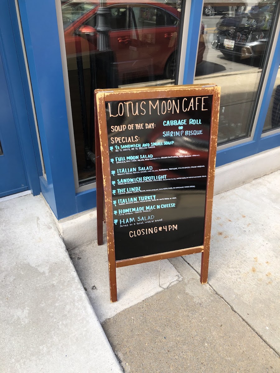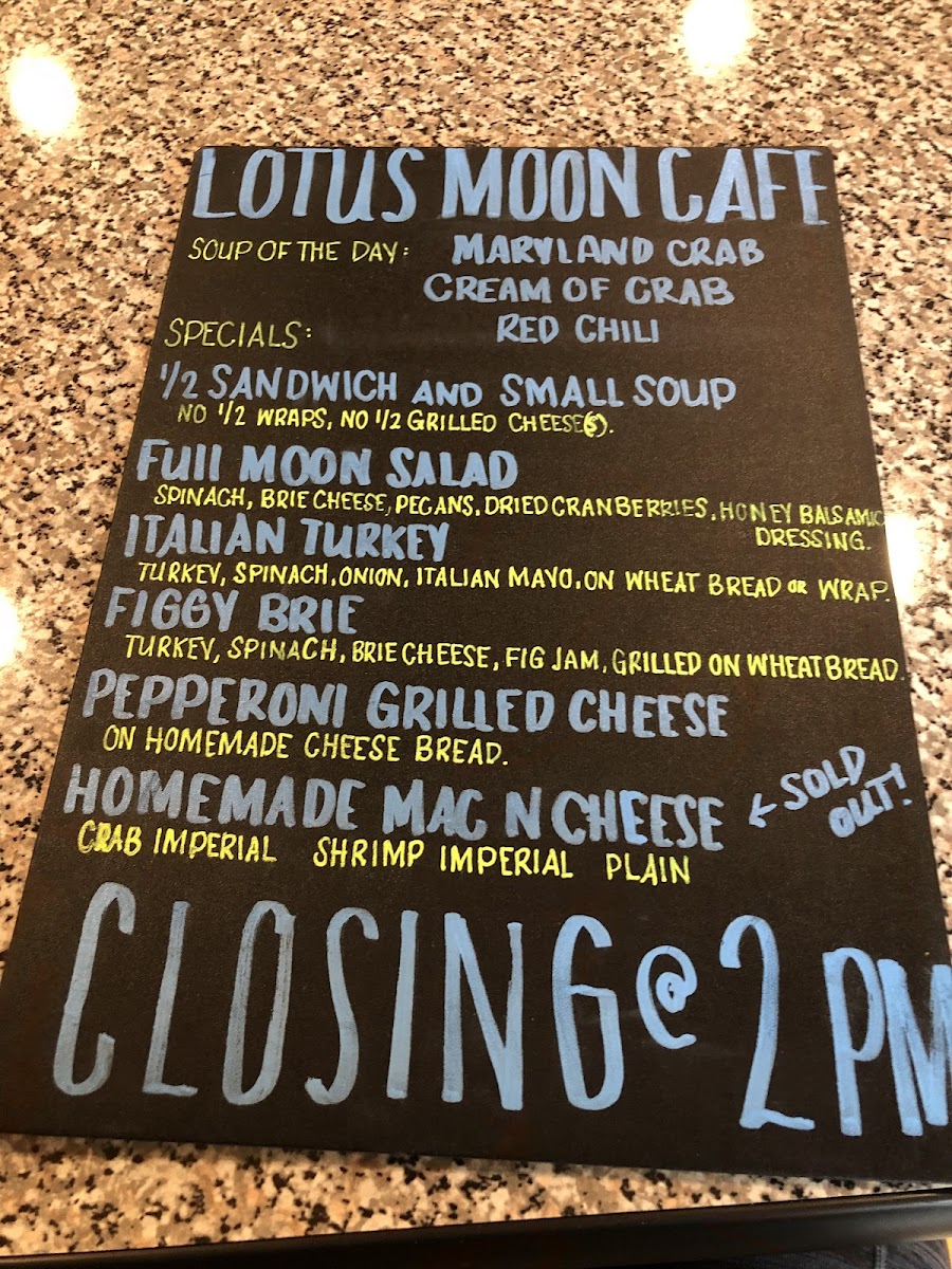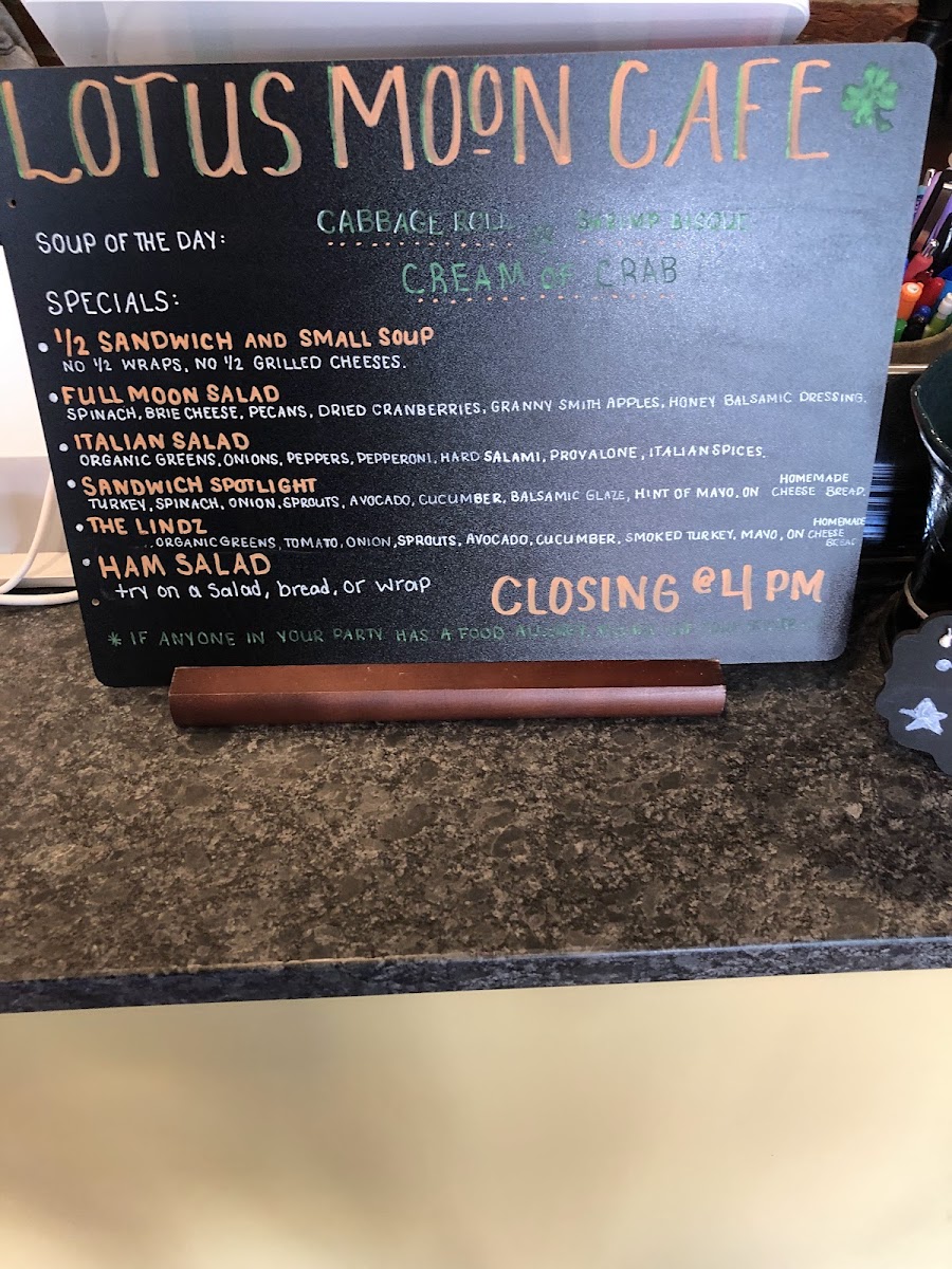 Welcome to Lotus Moon Cafe, a culinary gem nestled at 16 N Conococheague St, Williamsport, MD. Our menu is a delightful journey through flavors and textures, promising a feast that caters to all taste buds. Dive into our specialties and start your experience with the creamy indulgence of our Cream of Crab Soup or the heartwarming French Onion Soup. For the sandwich aficionado, our Lobster Grilled Cheese Sandwich is a must-try, alongside our savory Panini and fresh Tomato Basil Wrap that bursts with vibrant flavors. Don't miss our carefully curated Charcuterie, perfect for sharing, or enjoy a timeless Chef Salad for a lighter yet satisfying option. Complement your meal with our unique Dill Deviled Eggs or a classic Clam Chowder, and make sure to save room for our decadent Baklava. Whether you're celebrating a special occasion with our irresistible Wedding Cake or simply quenching your thirst with a refreshing Water Bottle, Lotus Moon Cafe is where culinary dreams come to life. Join us for a dining experience that's as delicious as it is welcoming.
